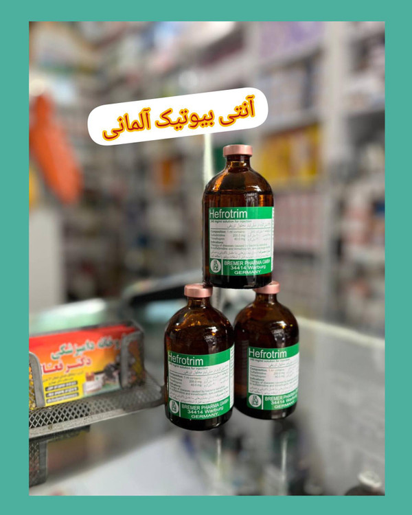 . هفروتریم شرکت برمر فارما آلمان محلول تزریقی برای گاو ،اسب،گوسفند،بز،سگ وگربه ماده موثره؛سولفادیمیدین سدیم و تریمتوپریم موارد مصرف؛درمان بیماریهای باکتریایی مانند؛عفونت تنفسی،ریه،پوست،دستگاه گوارش،مجاری تناسلی و عفونت ثانویه باکتریایی بعد از بیماری ویروسی مانند؛عفونت بندناف و عفونت سم مناسب موجود در داروخانه داروخانه دامپزشکی و پت شاپ دکتر فعّال ارائه انواع داروهای با کیفیت ایرانی و خارجی مشاوره دارویی و ثبت : تماس با شماره ۰۱۳۴۱۳۲۲۸۷۱ و ارسال پیام به ارسال دارو به سرتاسر گیلان و #تاپ_فید_عروس_هلندی #هفروتریم